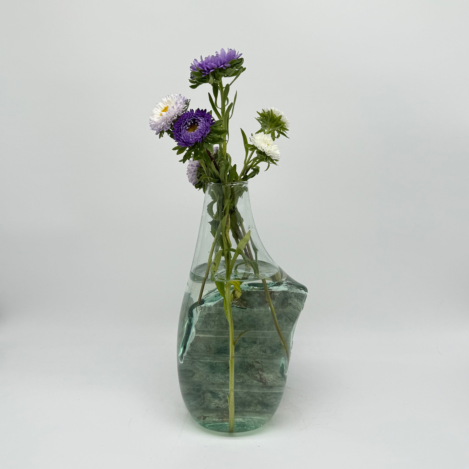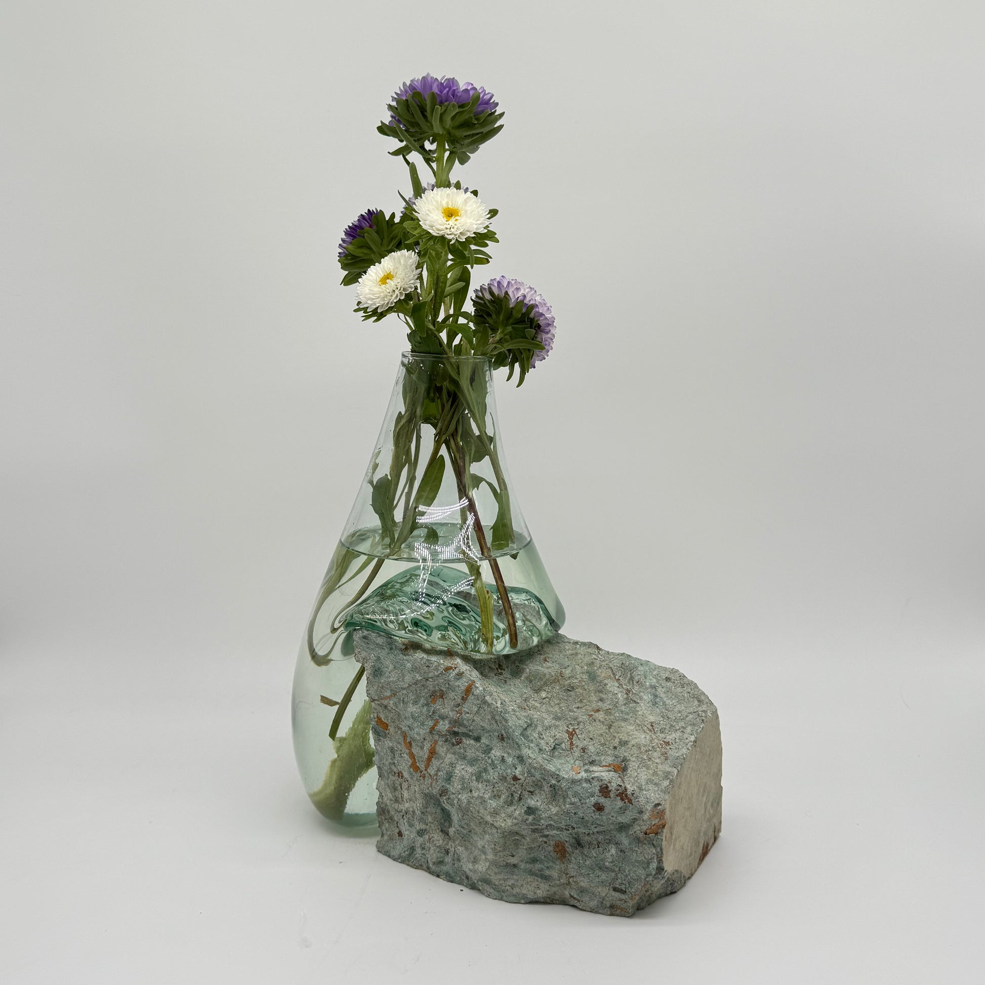 This handcrafted glass vase is set upon a striking natural blue stone, creating a bold contrast between transparent glass and mineral depth. Each piece is unique, reflecting both modern artistry and the timeless beauty of nature. More than just a vase, it is a sculptural centerpiece that adds elegance, individuality, and sophistication to any space