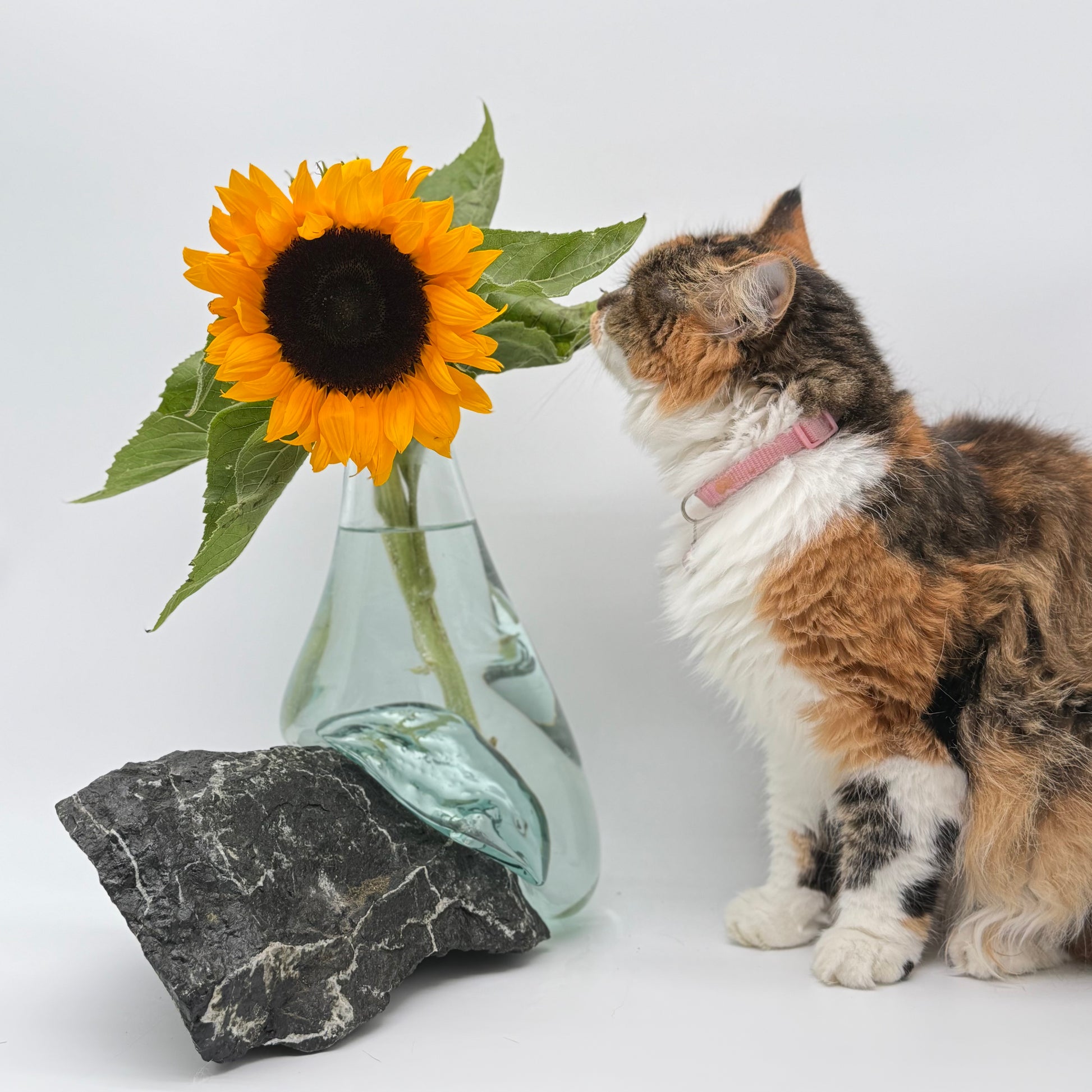 Each piece is made by skillfully molding molten glass over a natural stone, creating a one-of-a-kind design where no two vases are ever the same.