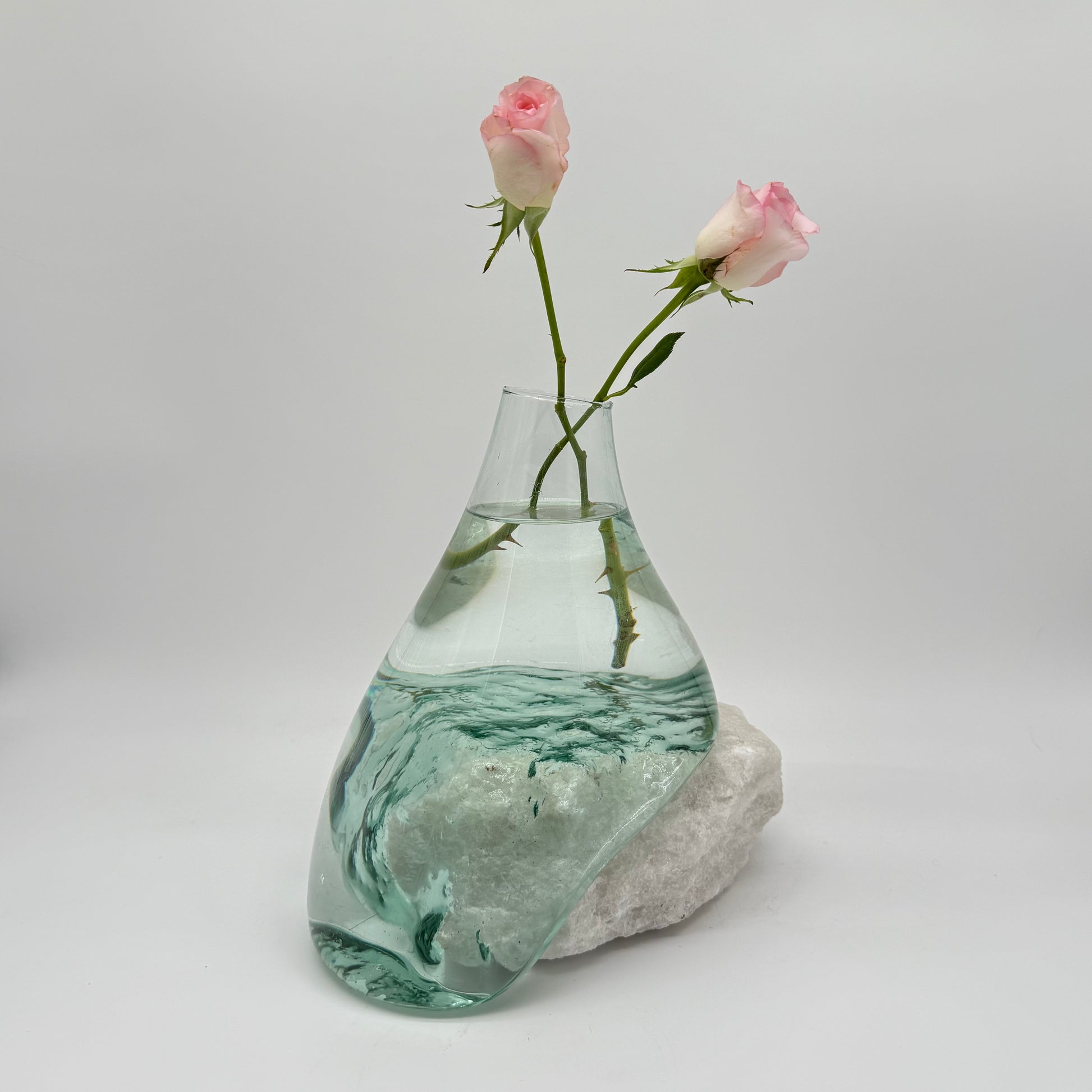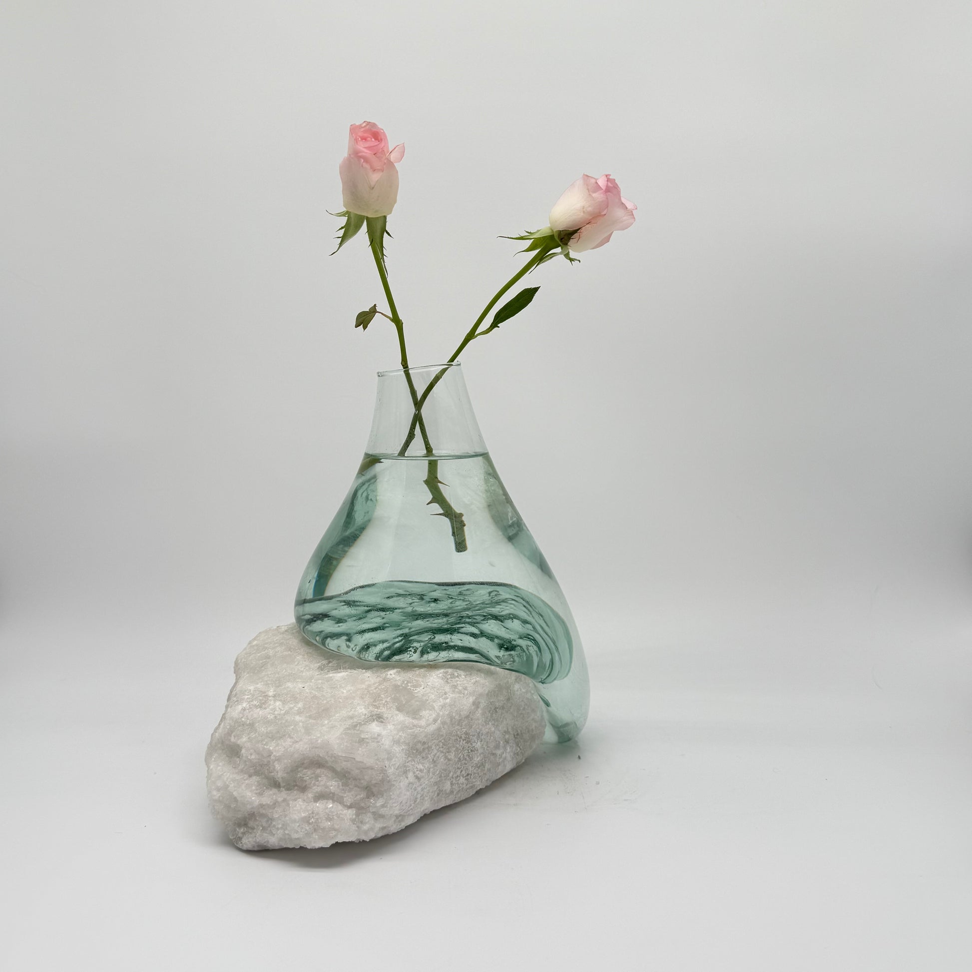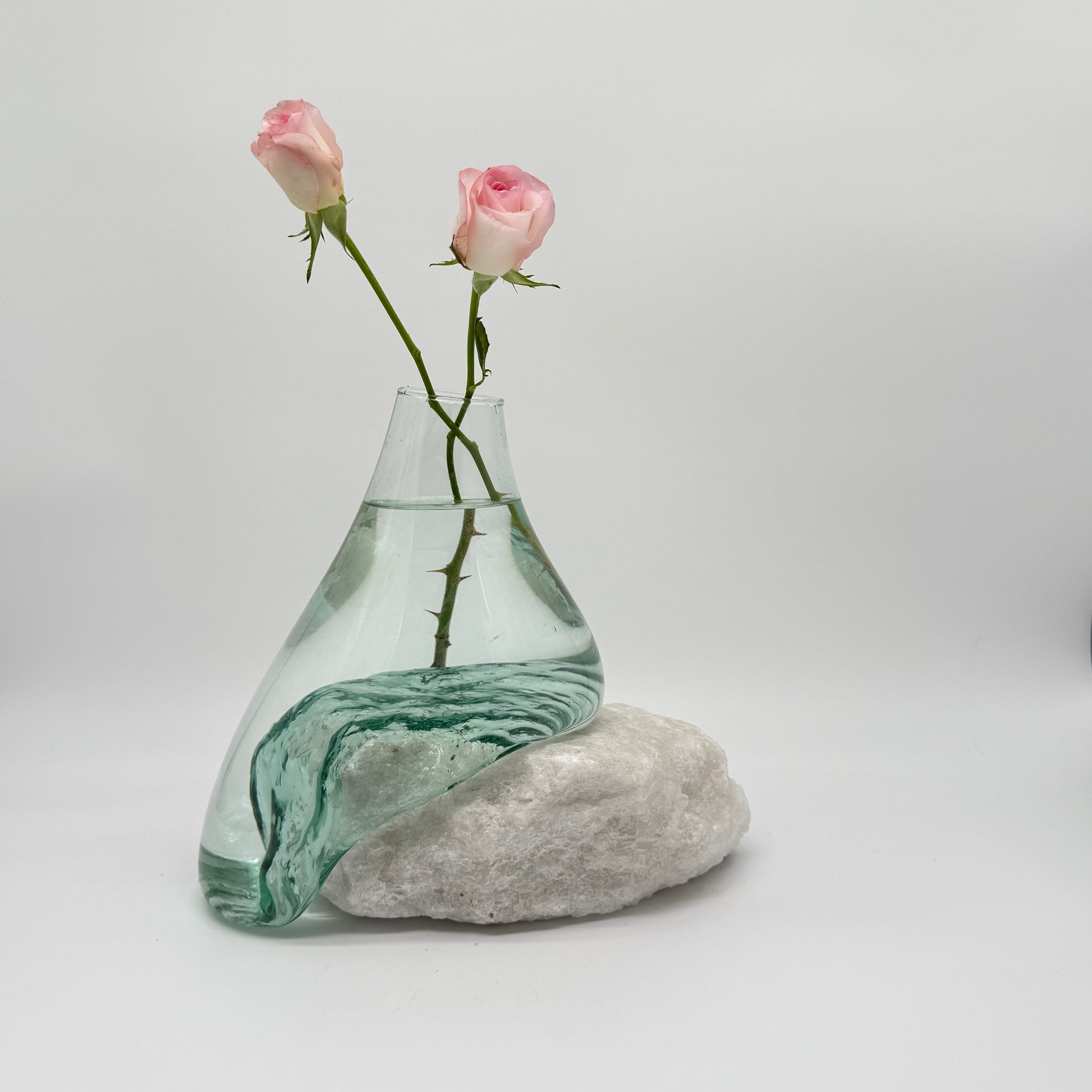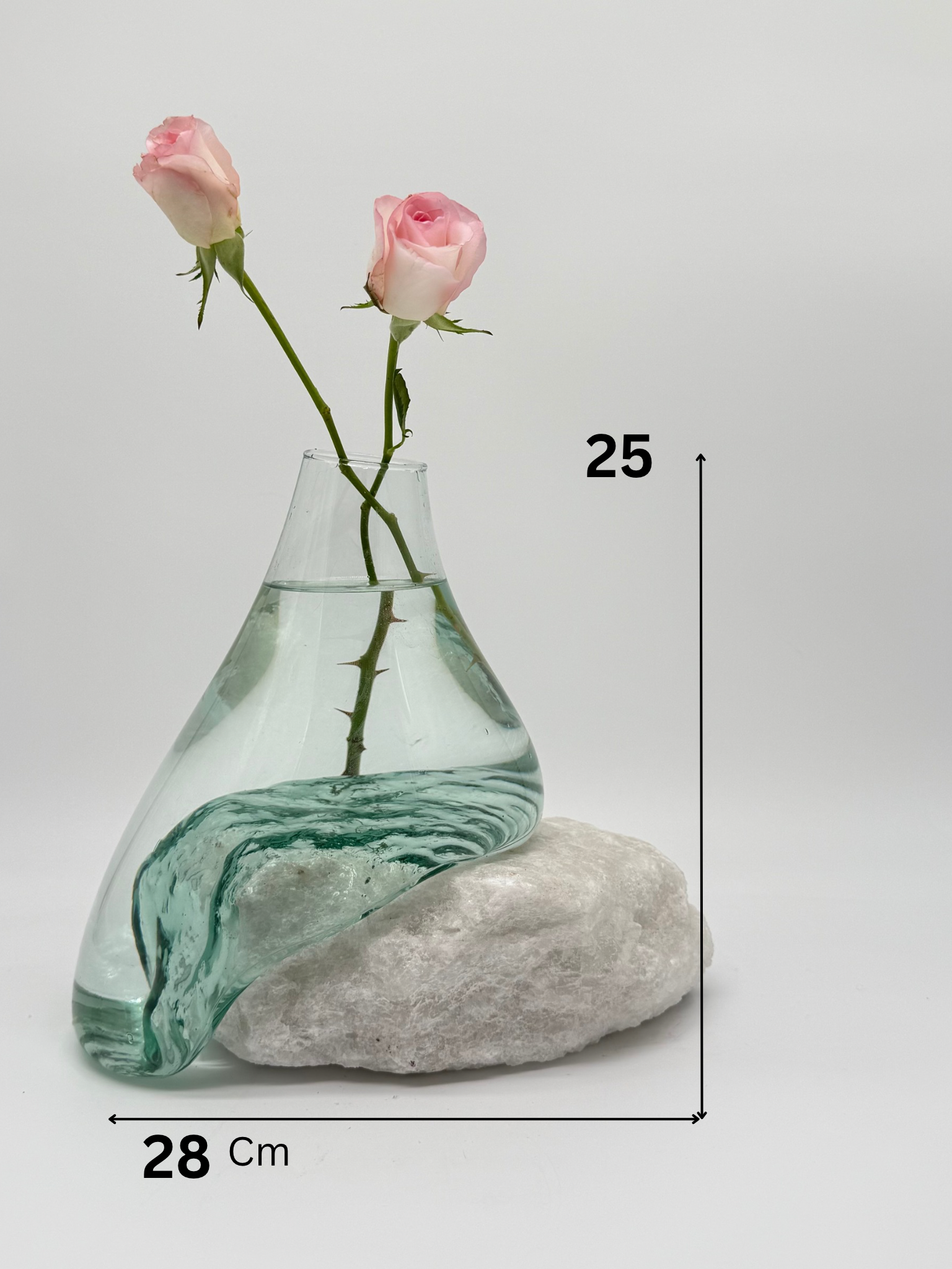 This handcrafted glass vase rests on natural white salt stone, symbolizing purity and timeless beauty. Each piece is one-of-a-kind, blending the crystal clarity of glass with the serene whiteness of salt stone. More than a vase, it is a sculptural artwork that brings elegance, harmony, and a sense of calm to any space. Perfect for refined interiors or as a rare collector’s treasure.