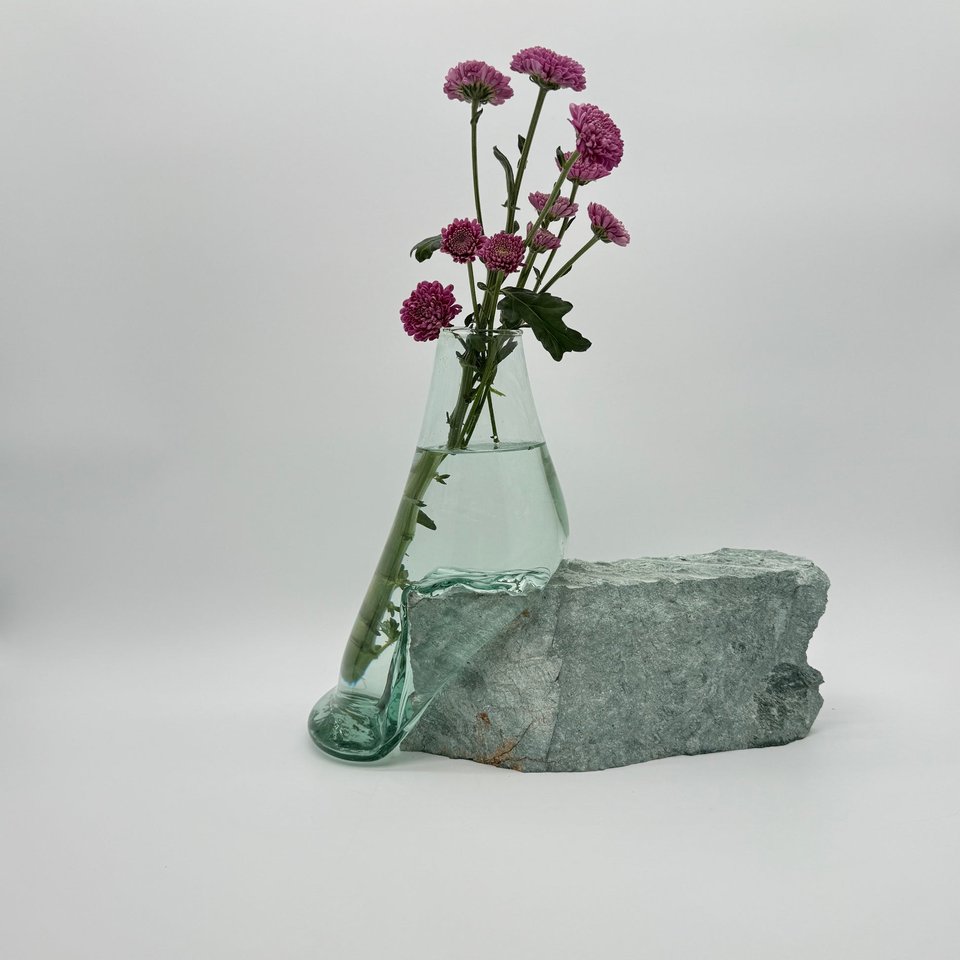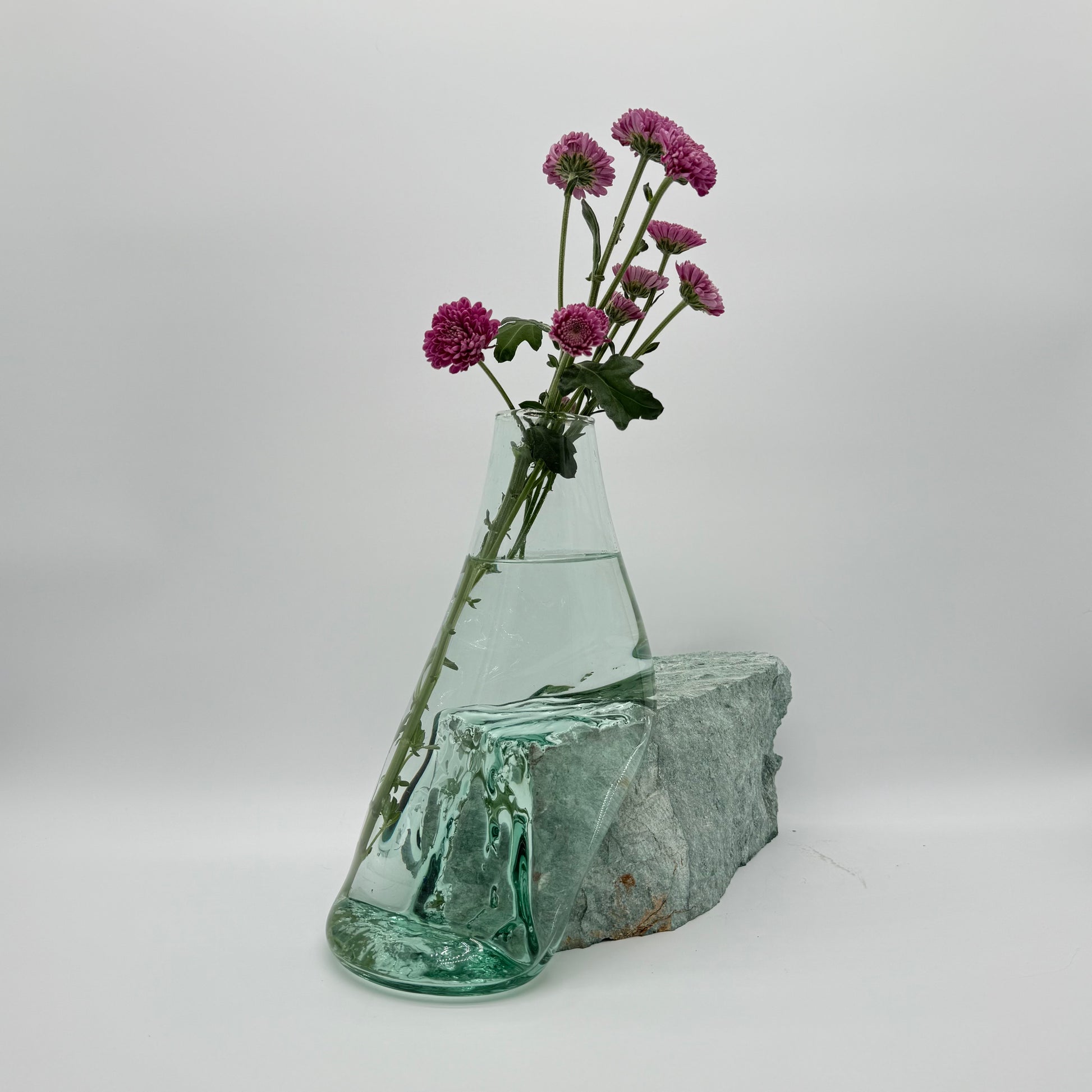 Add a touch of natural elegance to your home with this handcrafted molten glass vase on a natural blue stone base. Each vase is a unique creation, as molten glass is skillfully shaped to rest on raw stone, merging artistry with the calming beauty of nature.